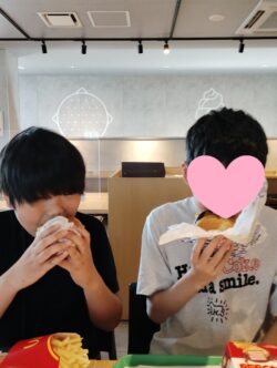 出来立てハンバーガーを満面の笑顔😁
