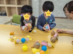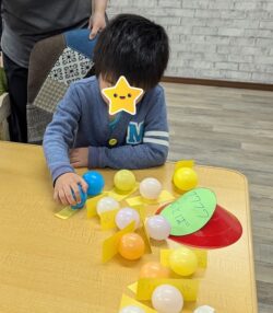 いろんな言葉が貼ってあるボールを仕分けしましょう