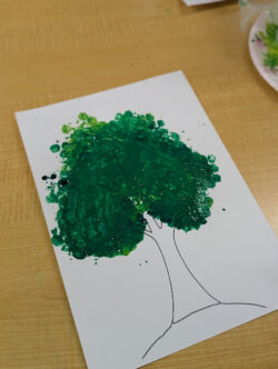 あらかじめ木の印刷をしてある画用紙に水彩絵の具を使って
