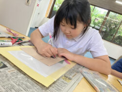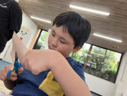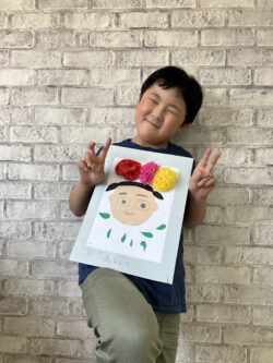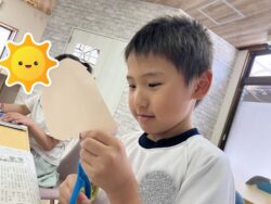 男の子は顔の形が描いてある紙をハサミで切って画用紙に貼り付けます🎵