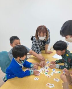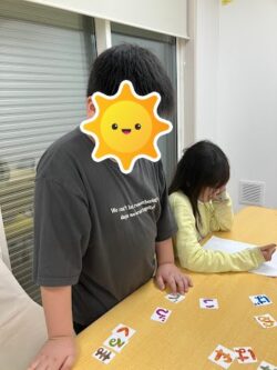 小さいお友達のお部屋ではみんなで協力し、「これどう?」と考える子、「○○あったよ❗」と文字を探す子に分かれて取り組みました☺️