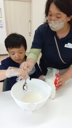 今日は、利用者さん皆さんで、おやつを作りました🍩