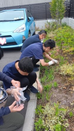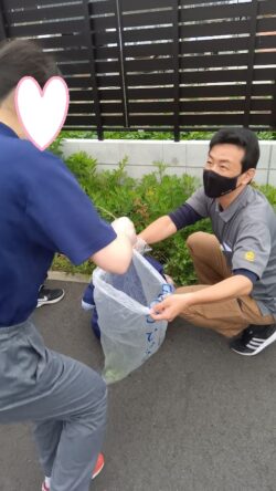 雑草も力いっぱい引っ張ってスタッフが持つビニール袋にポイッ!