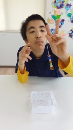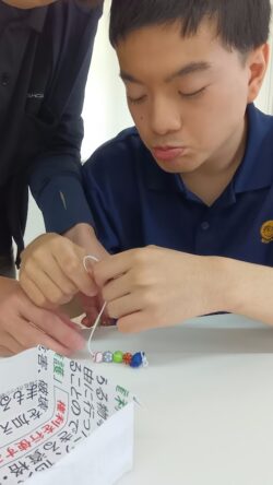 トレーニング班は紐にビーズを通してストラップ作りに挑戦!