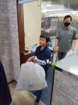 大きな袋にボトルを詰めて、口を縛ったらえっほえっほ!