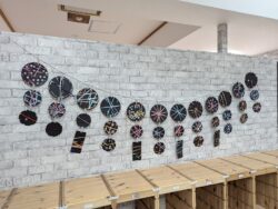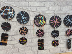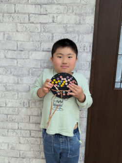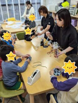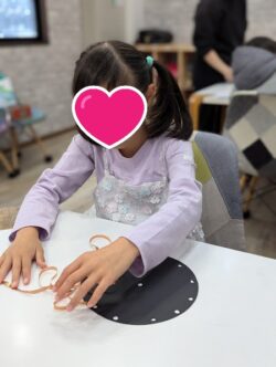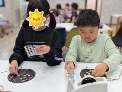 今月は、穴や切込みが入った黒い丸画用紙に、キラキラの紐やモールを通したり、