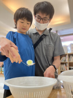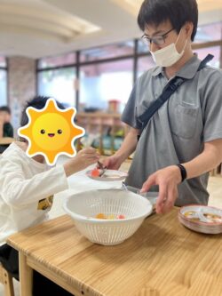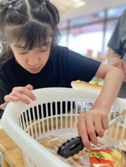 今回はトングやお玉、ピンセット(実際のバイキングでは使いませんが…)を用いて、様々な道具の使い方を学びつつ、道具に応じた指先の運動を意識して行いました✨