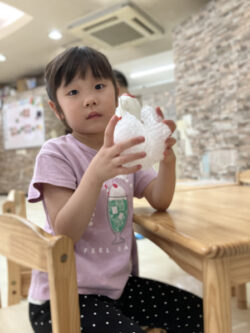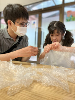 今日は【感覚遊び】の日。皆さんにとってお馴染みのプチプチ音が鳴る緩衝材をメインに使って、