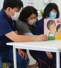 チームに分かれて紙芝居の読み聞かせ。読む、めくる、お助けの役目をこなしながら交替で発表。