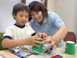 緑の画用紙を紙コップに貼って、カエルの姿を作っていきまーす。