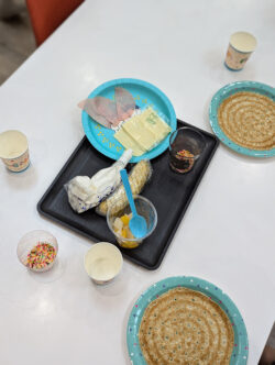 バナナ、フルーツ缶、チョコ―ソース、ハム、カラースプレー、生クリーム・・など、