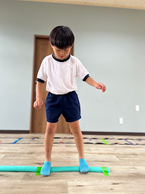 ②スポンジ棒の上をカニさん歩きで渡ります。
