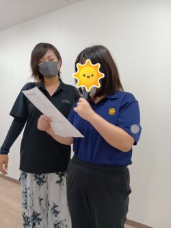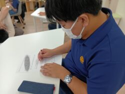 プリントに上手に名前を記入して、スタッフの説明を聞きながら今月特に頑張った事を選びます。