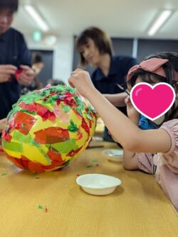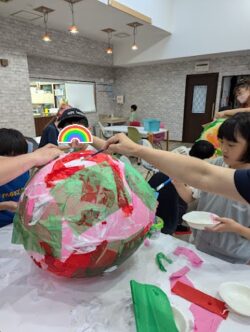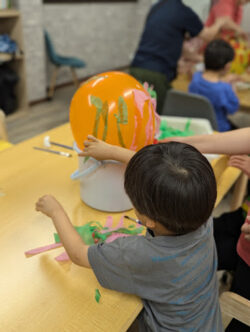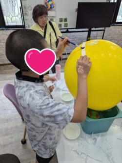 次に、風船に水で溶かしたのりをつけて貼っていきます