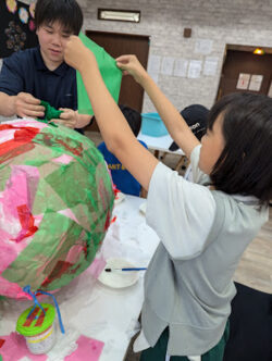 風船にのりをつけて和紙を張っていきます