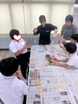 紙コップに好きな色の透明ちよがみをぺたぺた貼っていきました~!