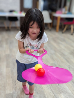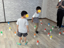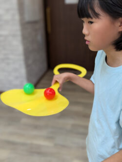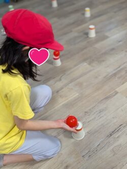 ランダムに転がったボールをカップの上に乗せるというトレーニングと、ボールを落とさずに運ぶという2種類のトレーニングを行いました。