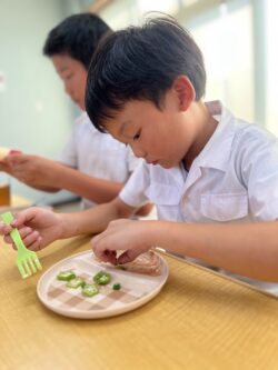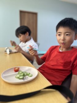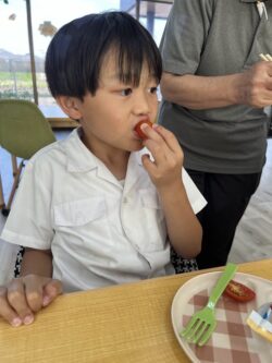 おやつの時間には、りっと菜園で収穫したミニトマトとオクラを