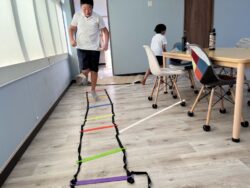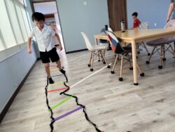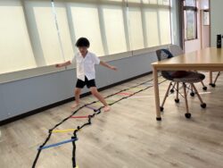 最初は、紐を2か所張って、1本目はくぐり、2本目は両足で飛び越えます。