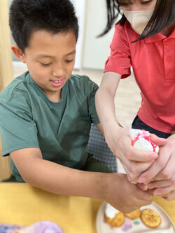 あま~いクリームが溢れないよう慎重に、、、がんばって!!🍰
