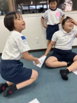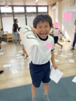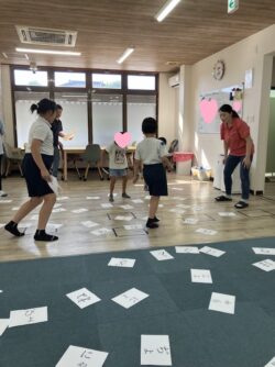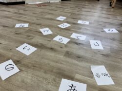 ひらがな50音+濁音/半濁音を含めた文字数で、一文字ずつ書いてある紙を、みんなで部屋全体に散りばめました。