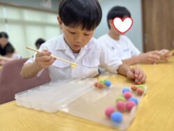 ②箸を使って、小さなモヘアのボールを色ごとに分けていく