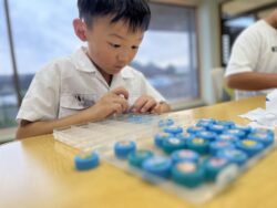 ①ペットボトルキャップのイラストとケースにあるイラスト、同じイラストを見つけてケースに入れていく