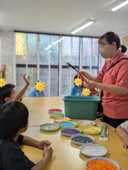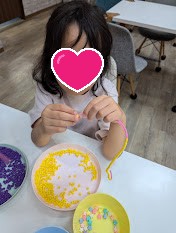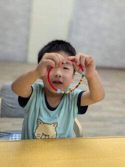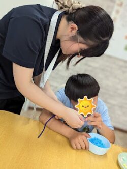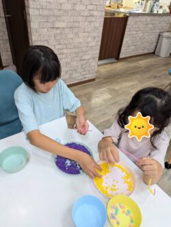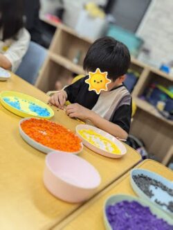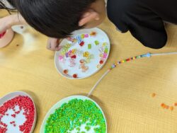 また、ビーズに触れながら「どこに何を置こうかな」「どの色やビーズを使おうかな」と