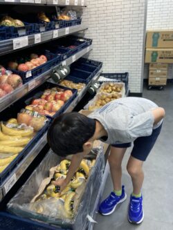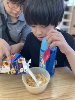 買い物に行ったり、バナナを切ったり、牛乳をそそいだり…とみんなで分担して作りました(^^♪