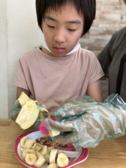 次は、バナナを切っていきます…💖スタッフの真似をしながら、スプーンで上手に切っていきます!