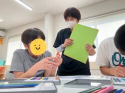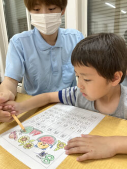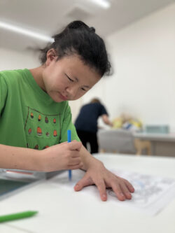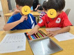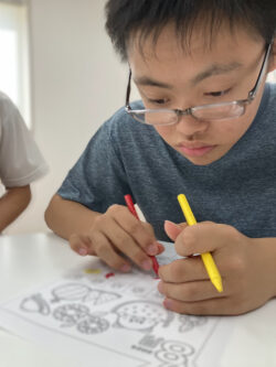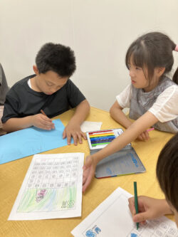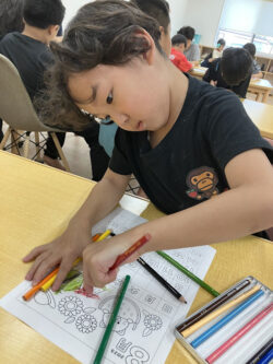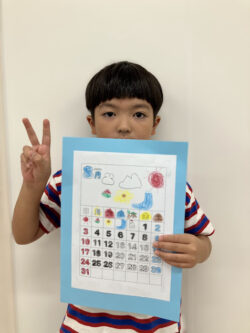 夏を感じさせるスイカやお花、帽子などの塗り絵に好きなように色を塗って自分だけのオリジナルカレンダーを作ったよ(*^^)v