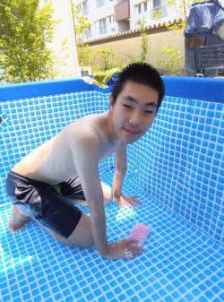 スタッフと一緒にプールを広げてスポンジでゴシゴシ🧽