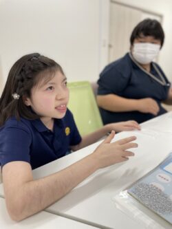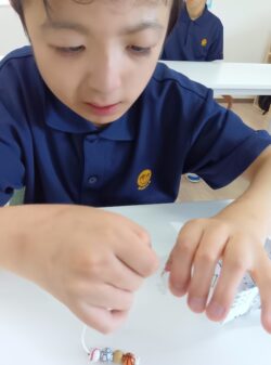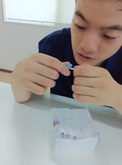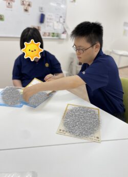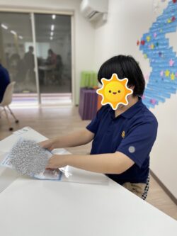 午後は指先のトレーニングとしてビーズの紐通しや、