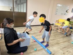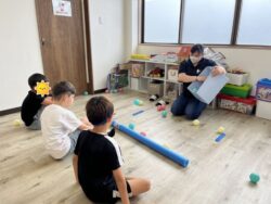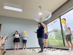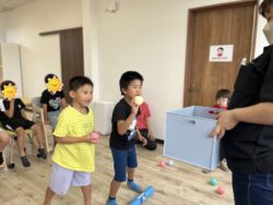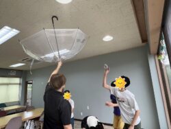 新聞紙ボールを作って、傘に向かって投げるぞ~!