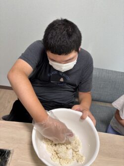 ②白玉の生地を少量ずつ取り、手のひらで転がしながら丸く整える。平たくする。