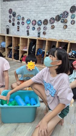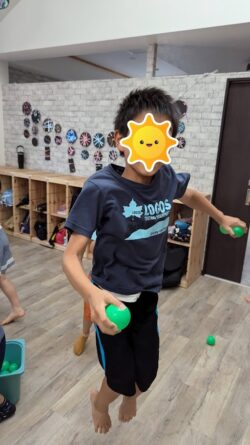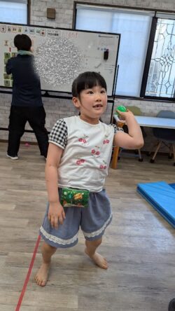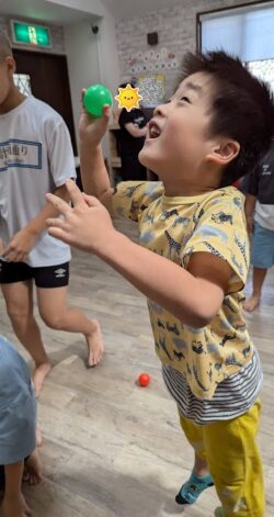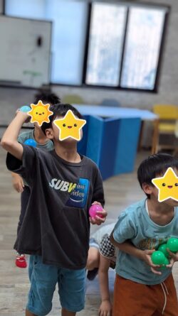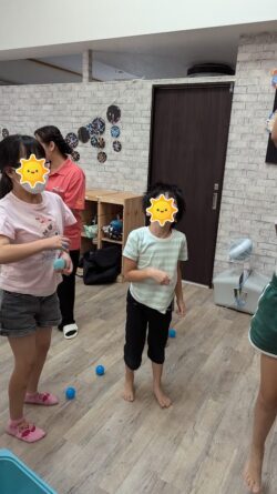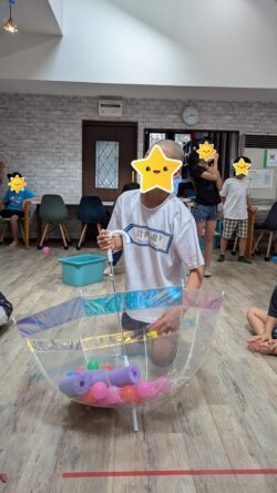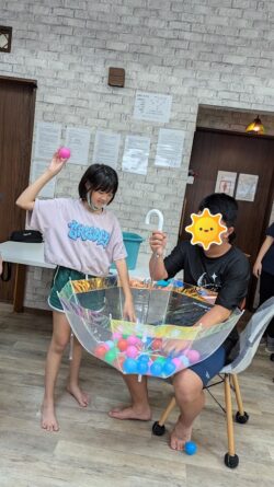 みんな真剣な表情でボールを傘に入れています👍