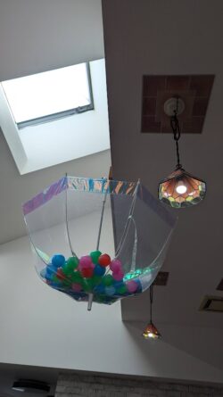 今回の玉入れは、天井に透明の傘を引っ掛けて、
