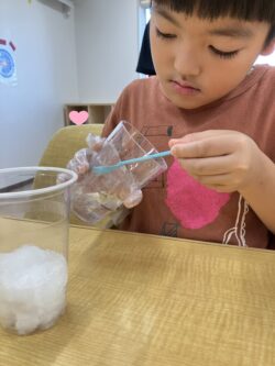 今回は、吸水ポリマーに水を入れて変化を観察して雪を作る実験を行いました☝️