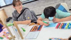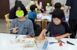 真剣に射的の的にイラストを描いています