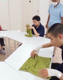 指先運動はタオル畳みはご家庭で行っていたりで慣れた手つきで進める方も。