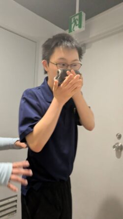 口を塞ぎながら、非常口のマークの扉を開けて進みます!