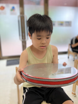 次にタンバリンでごあいさつ。先生の後に続いてリズムを意識して叩きます😉