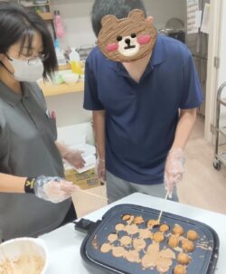 アメリカンドックはたこ焼き器で丸く。ウインナー入りとココア味の2種類。