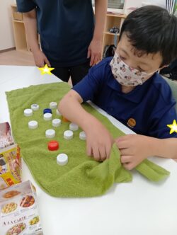 今日は、ペットボトルキャップの色分けをしました!