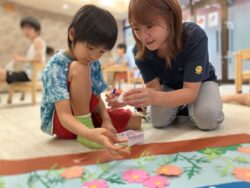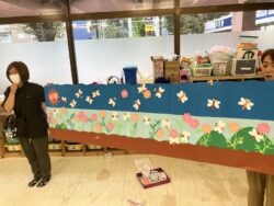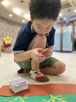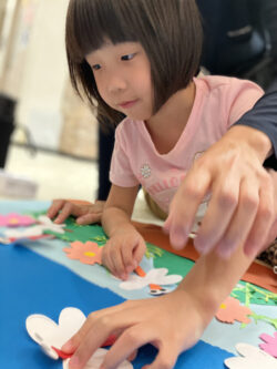 前回の全体課題で皆で作ったコスモスのお花とトンボを、