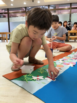 トンボやコスモスを思い思いのところに貼り貼りして…。