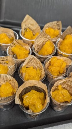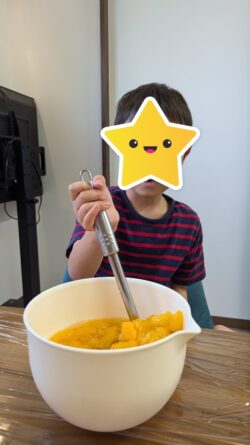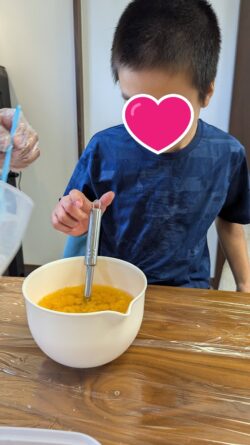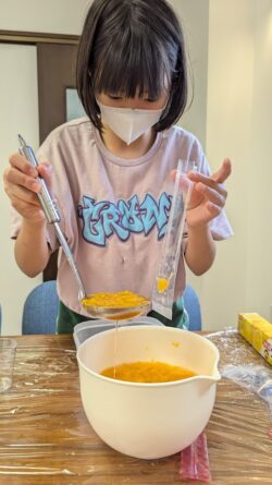 自分で材料を軽量して、混ぜてバットに流し込み、冷やして固まるのをワクワクしながら待つ子どもたち😆