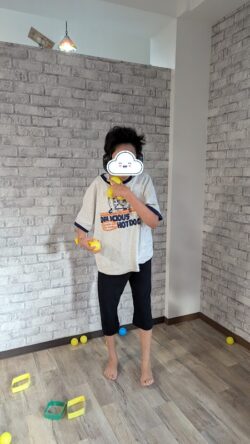今回は、「赤🍎・青🌊・黄🍌・緑🥒のカゴを用意し、それぞれの色に合わせてカラーボールやアイテムを入れていく」チームと、
