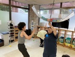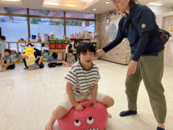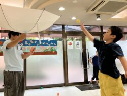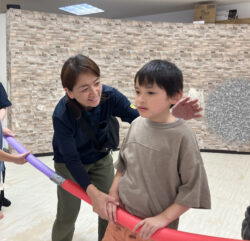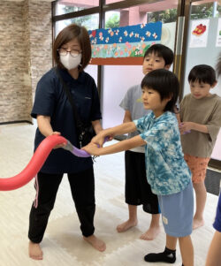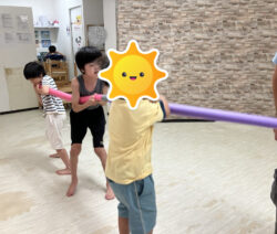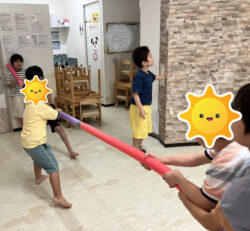 次はウレタン素材の棒を繋いだものを綱に見立てて綱引きです。