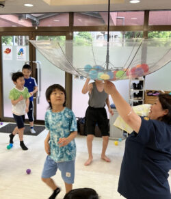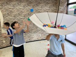 そして最初の種目の玉入れは、逆さの傘にボールを入れます。